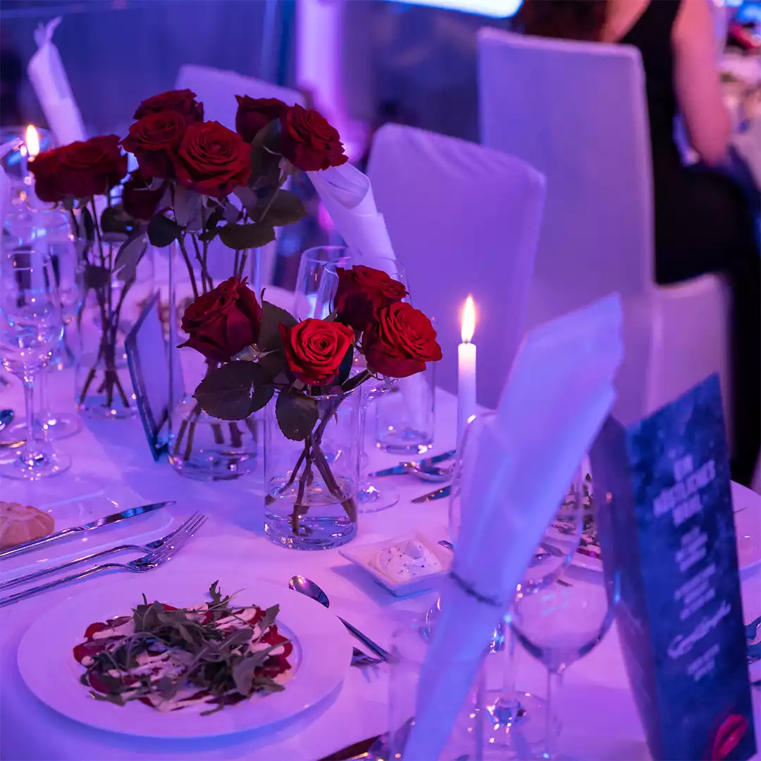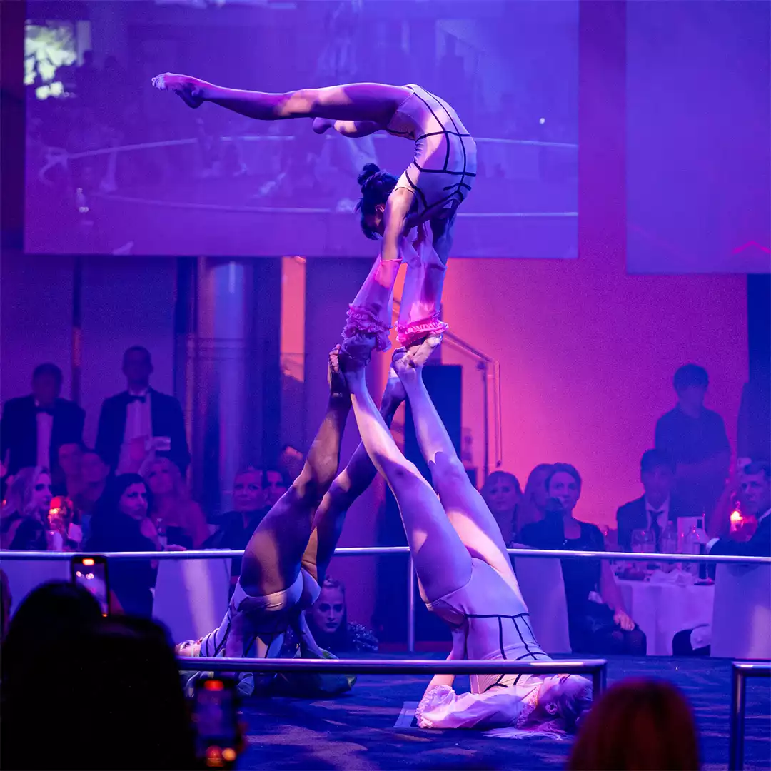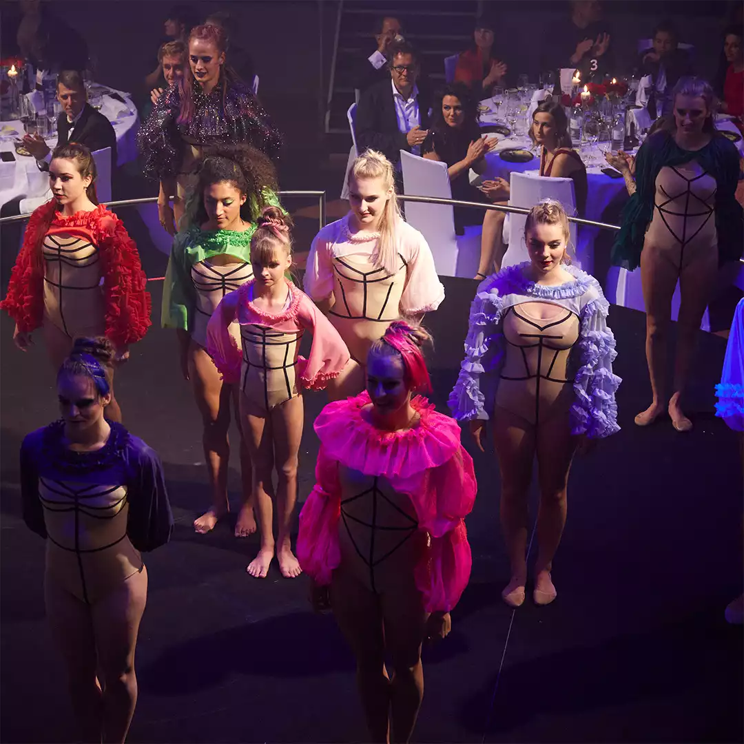 Nach dem offiziellen Teil und dem großartigen Galadinner überraschte Pascal Chanterie das Publikum. Seine Tanzkompanie stürmte das Zentrum des Saales und legte eine Performance zwischen Kunst und Akrobatik hin, bei der man für Augenblicke das Atmen vergaß. Eine großartige Show von hervorragenden Tänzerinnen. Und die perfekte Überleitung zum letzten Akt des Abends. Sekunden nach dem Applaus für den Auftritt begann die Bühne nach oben zu schweben und anstelle dessen tauchte ein Steg auf, der den Saal nun mit einem Nebenraum verband. Im gleißenden Licht erkannte man darin die Silhouette des DJ´s …