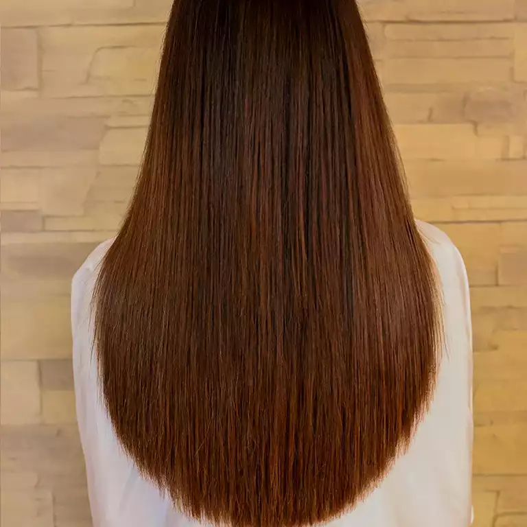 Doch erst als sie von den flexiblen GL Tapes hörte, war sie überzeugt, dass Extensions trotz ihres schnellen Lifestyles machbar sind. Von Natur aus ist ihr Haar kraus und schulterlang, dabei ist ihre Traumfrisur glatt und lang.