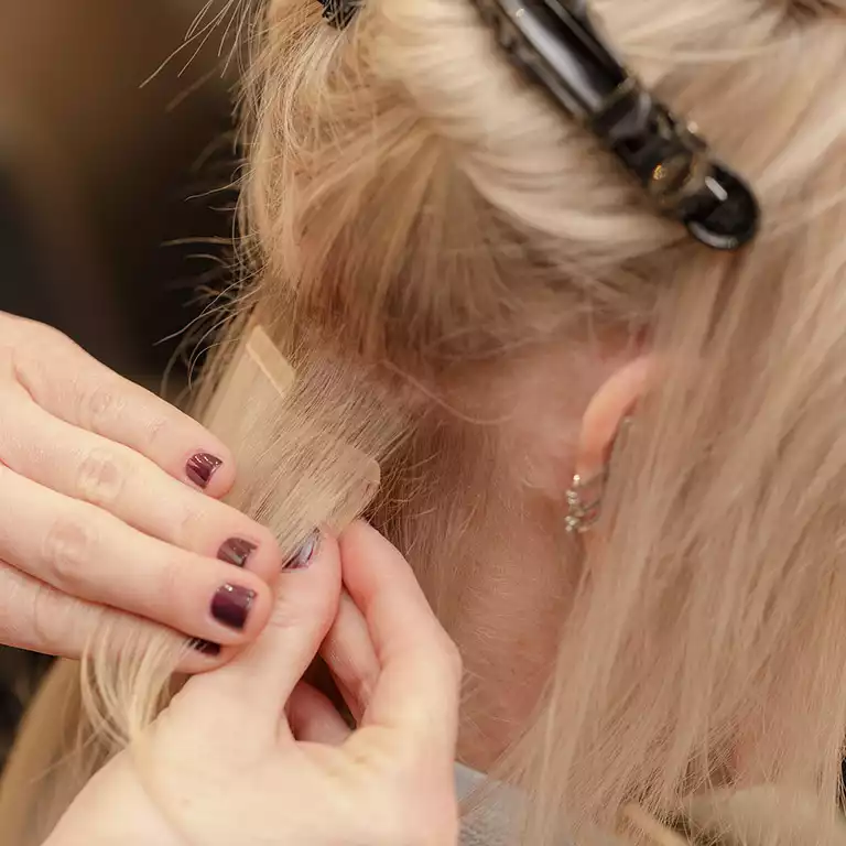 Sie arbeitete insgesamt zehn Double-Tapes mit 35 Zentimeter Länge und 16 Double-Tapes in 25 Zentimeter Länge ein. Für das gewisse Etwas wurden darüber hinaus noch sechs einzelne Tapes in das Haar gesetzt. Der kühle Blondton der Farbe Nummer 59 eignete sich perfekt, um den speziellen Typ von Gisela zu unterstreichen.