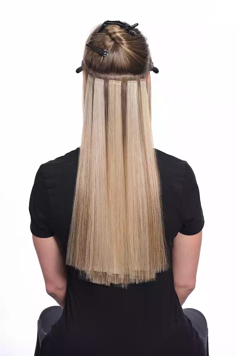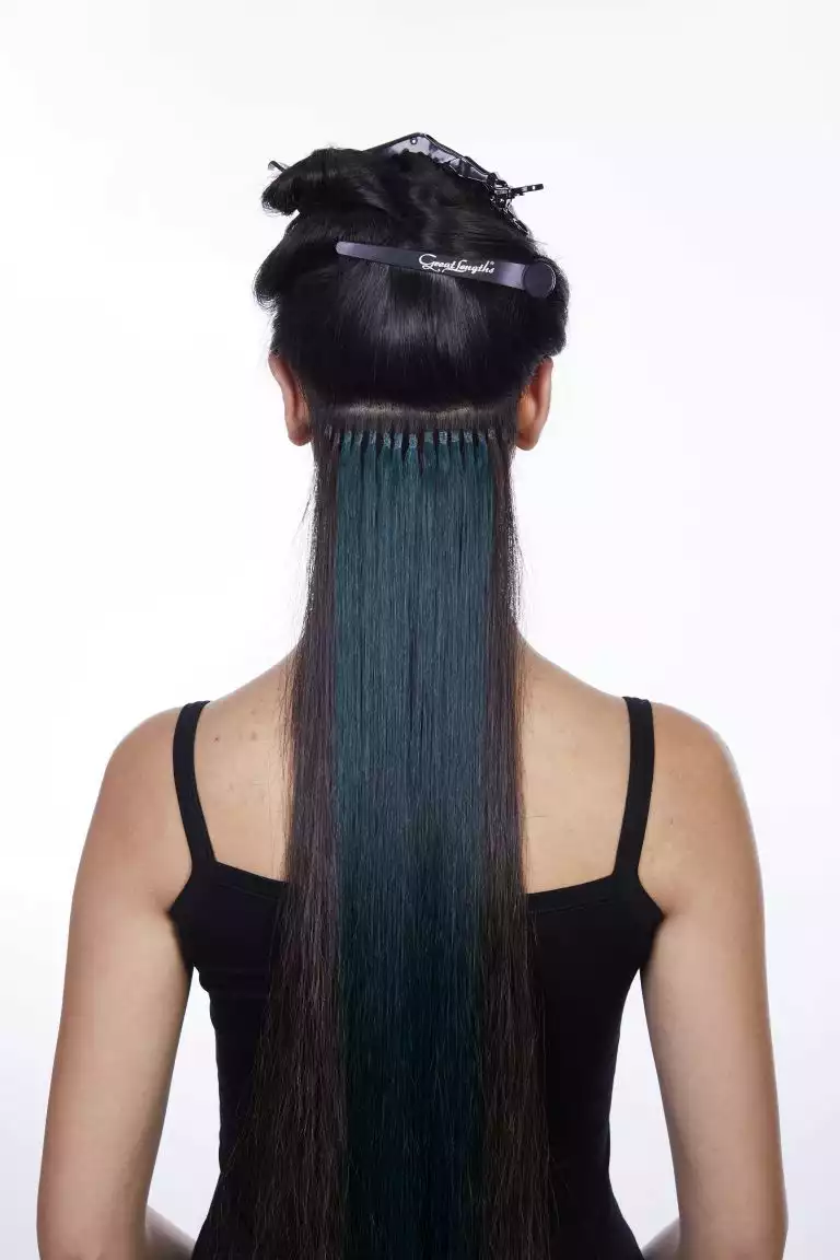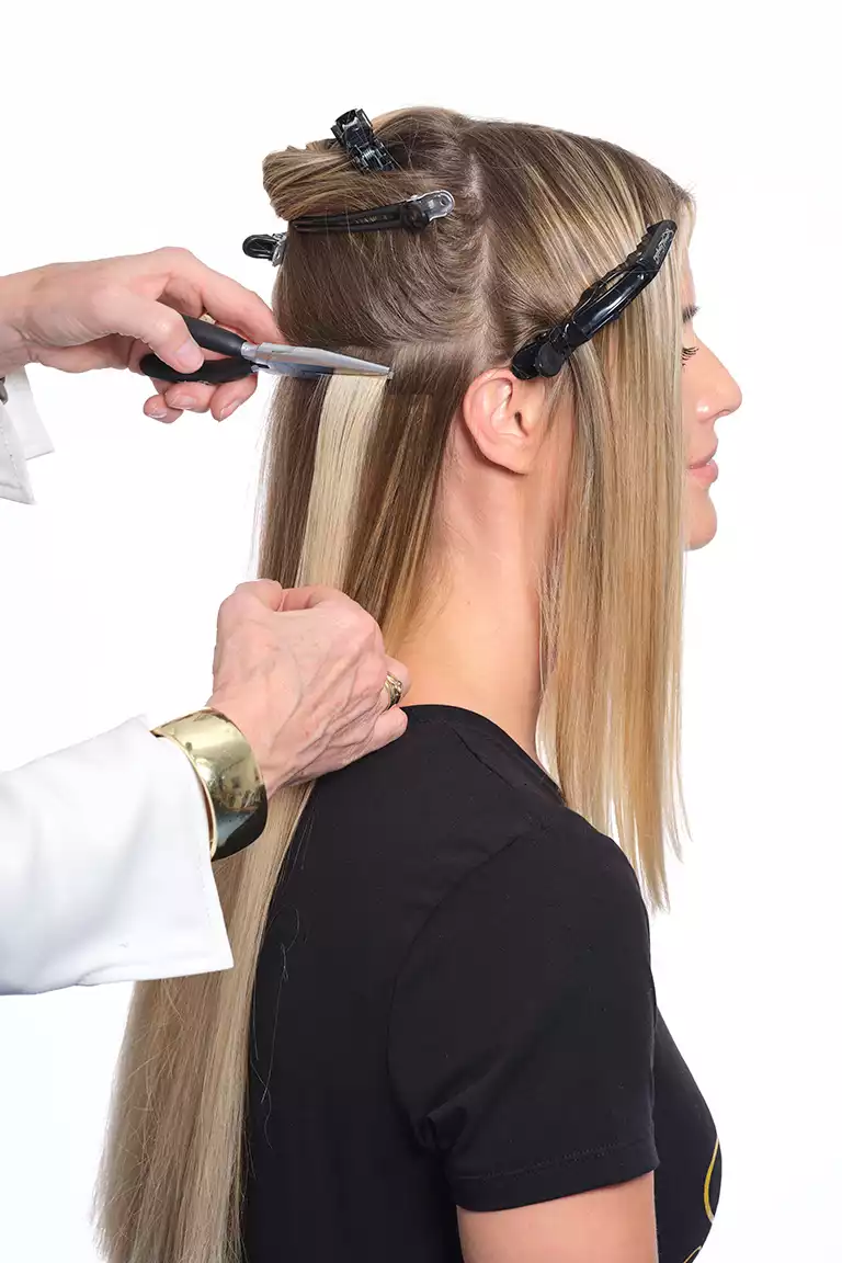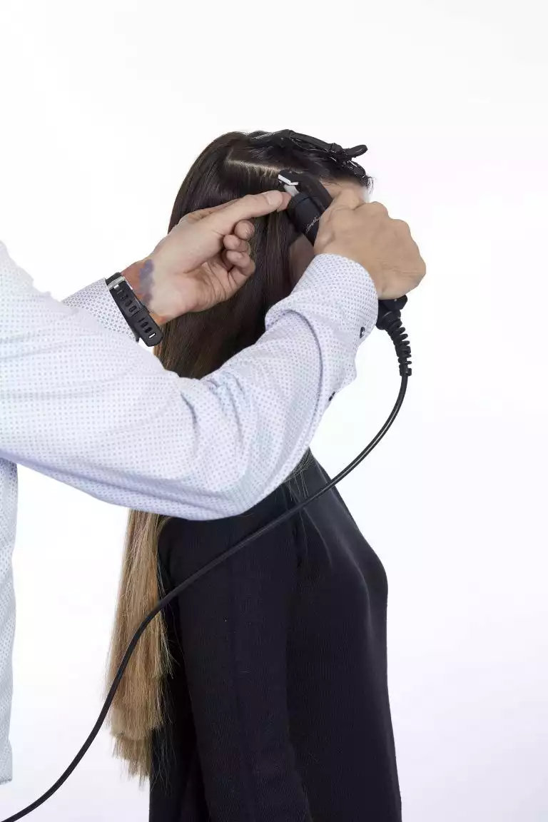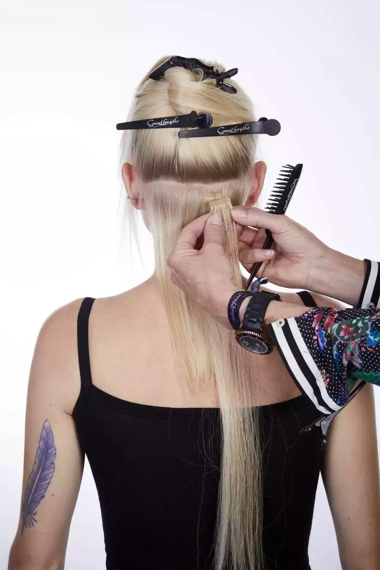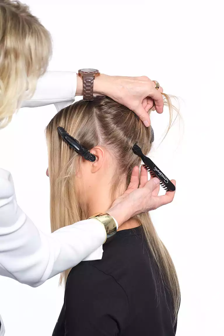 Sie arbeitete diese mit der Hollywood-Technik ein. Dabei werden die Bondings nicht über den ganzen Kopf verteilt, sondern man beschränkt sich auf die Seitenpartien und hält den oberen Hinterkopf frei. Schon mit drei bogenförmigen Reihen lässt sich so eine komplette Haarverlängerung machen!