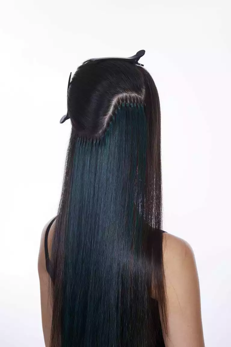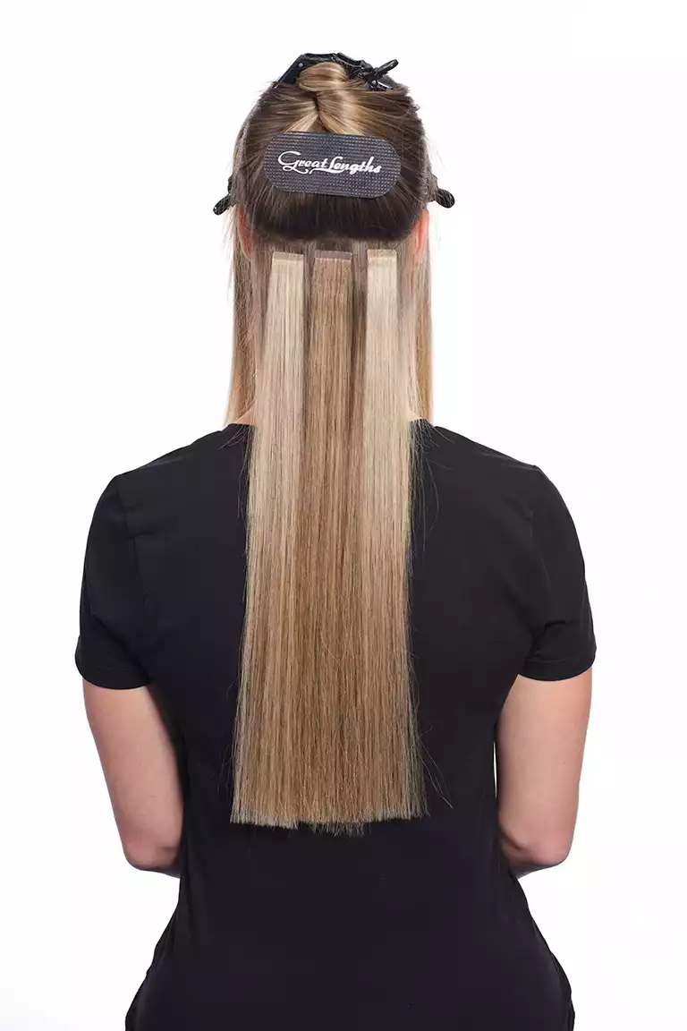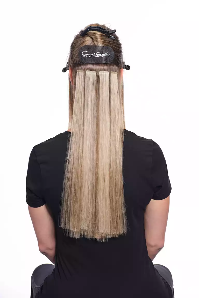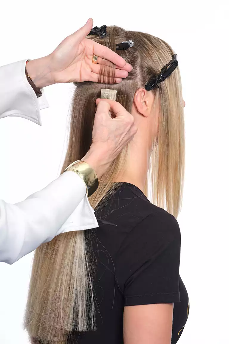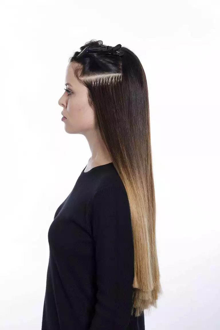 Sie arbeitete diese mit der Hollywood-Technik ein. Dabei werden die Bondings nicht über den ganzen Kopf verteilt, sondern man beschränkt sich auf die Seitenpartien und hält den oberen Hinterkopf frei. Schon mit drei bogenförmigen Reihen lässt sich so eine komplette Haarverlängerung machen!