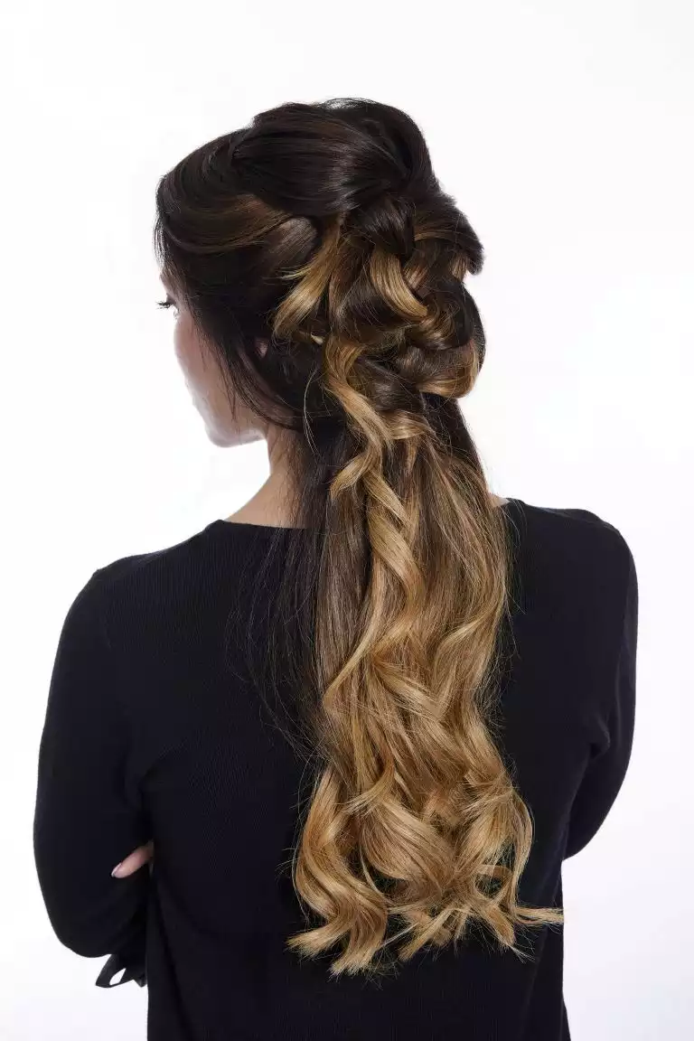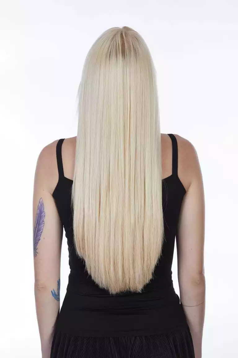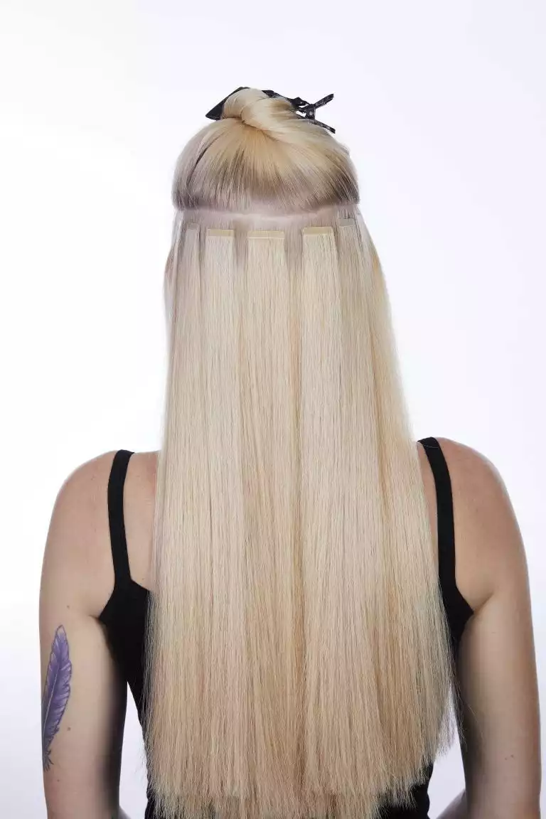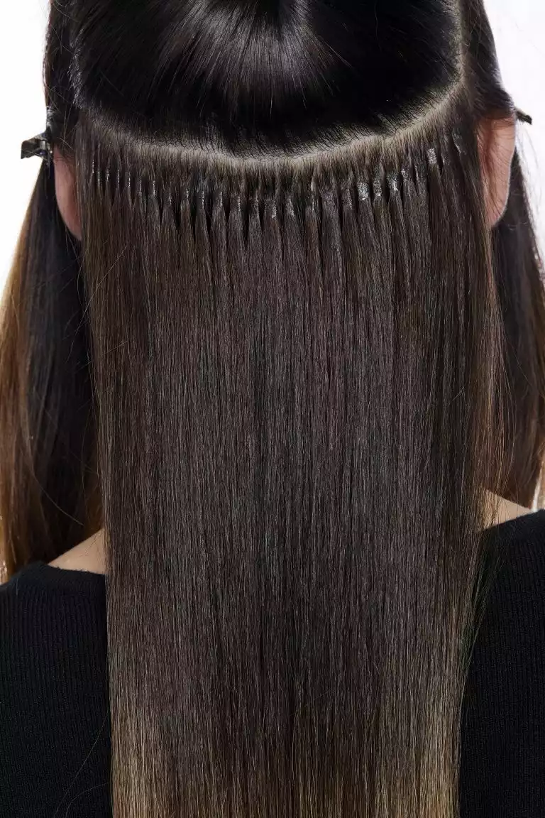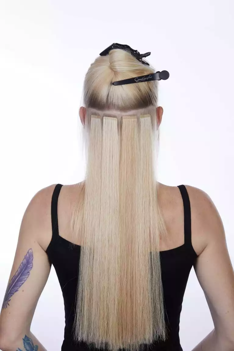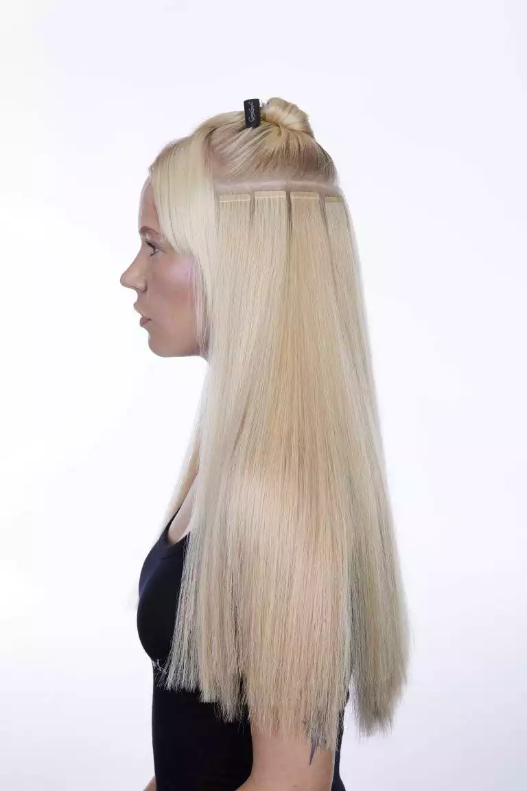 Sie arbeitete diese mit der Hollywood-Technik ein. Dabei werden die Bondings nicht über den ganzen Kopf verteilt, sondern man beschränkt sich auf die Seitenpartien und hält den oberen Hinterkopf frei. Schon mit drei bogenförmigen Reihen lässt sich so eine komplette Haarverlängerung machen!