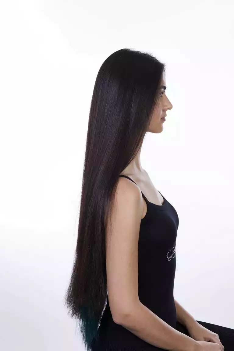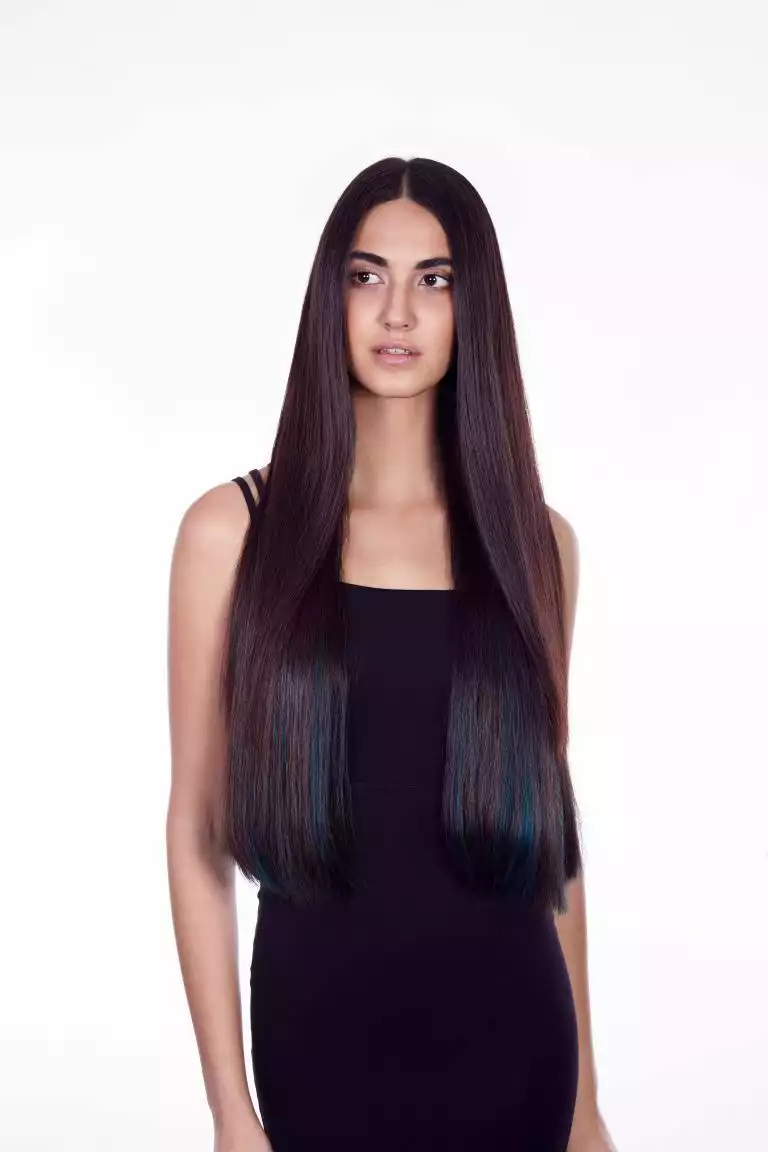 Priyas Eigenhaar ist wunderschön. Und doch lässt sich mit hochwertigen Extensions von Great Lengths auch hier noch eine sichtbare Steigerung erzielen. Ronnie Meisen griff zur Farbe 1b in 60 cm und zu schimmernden jewel green Strähnen.