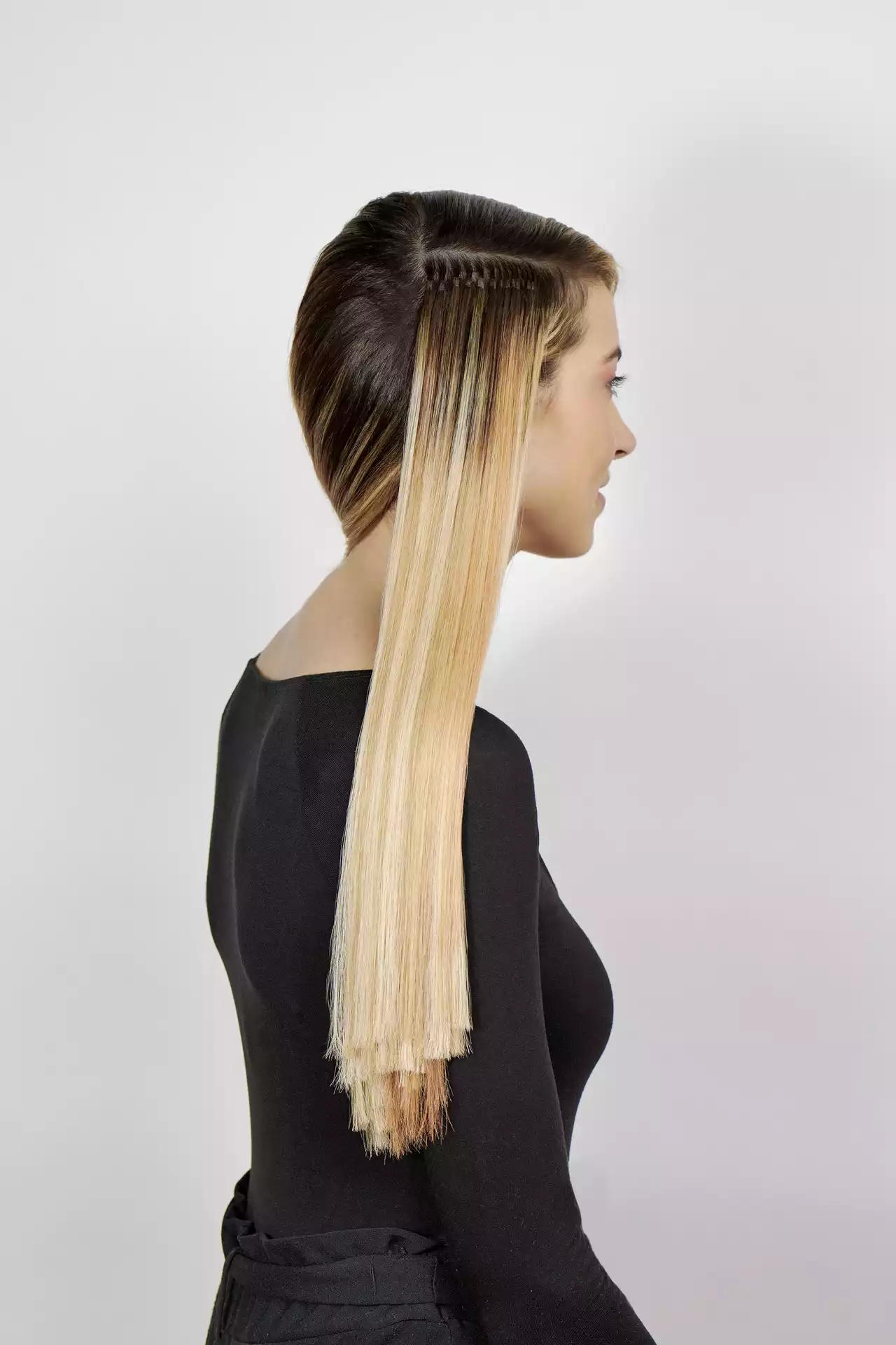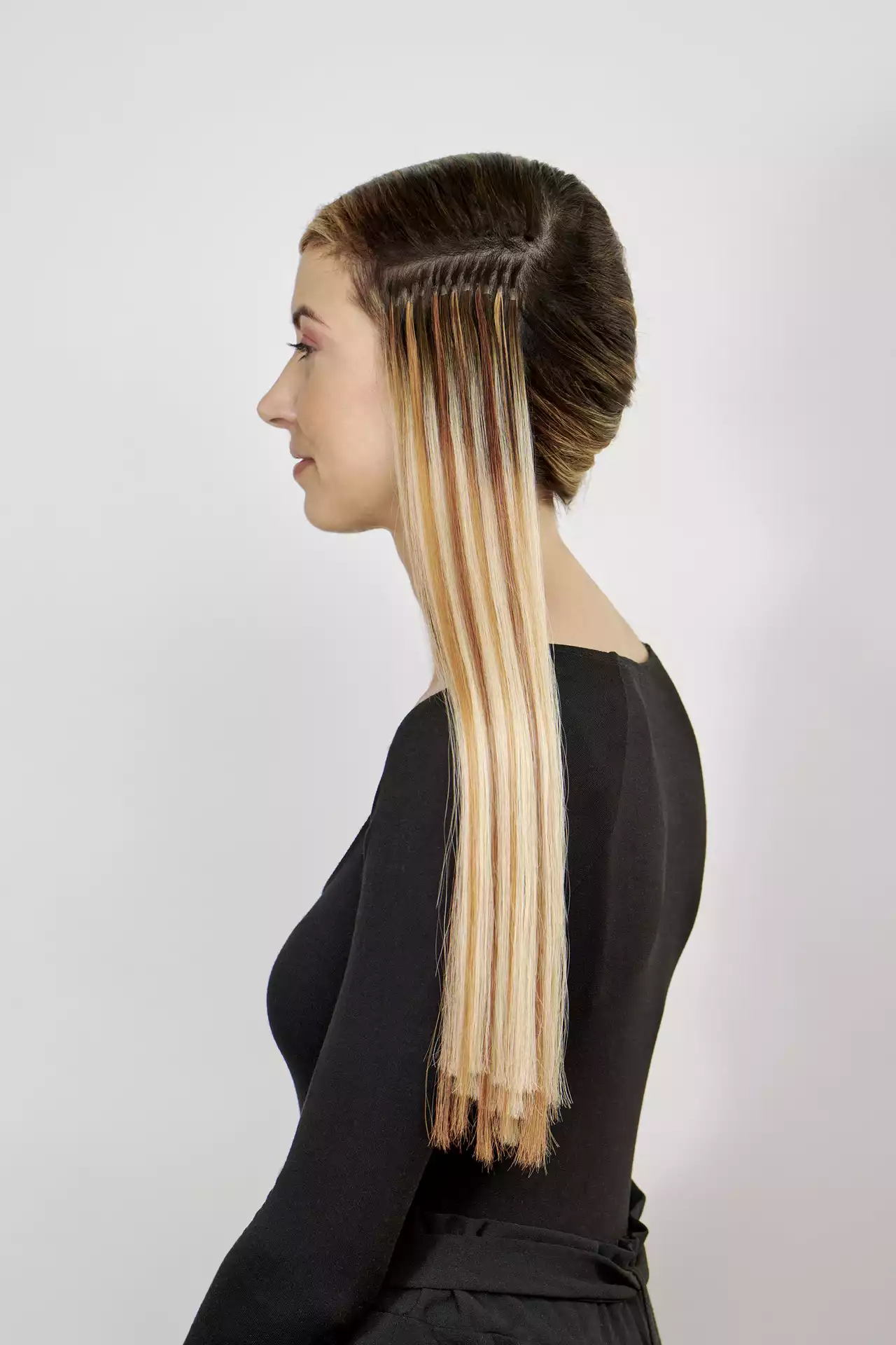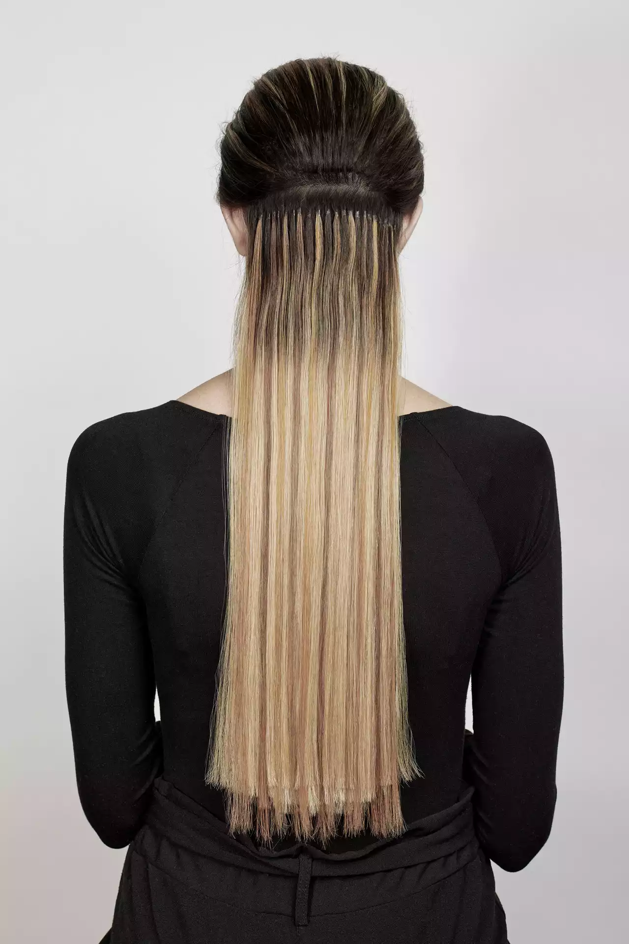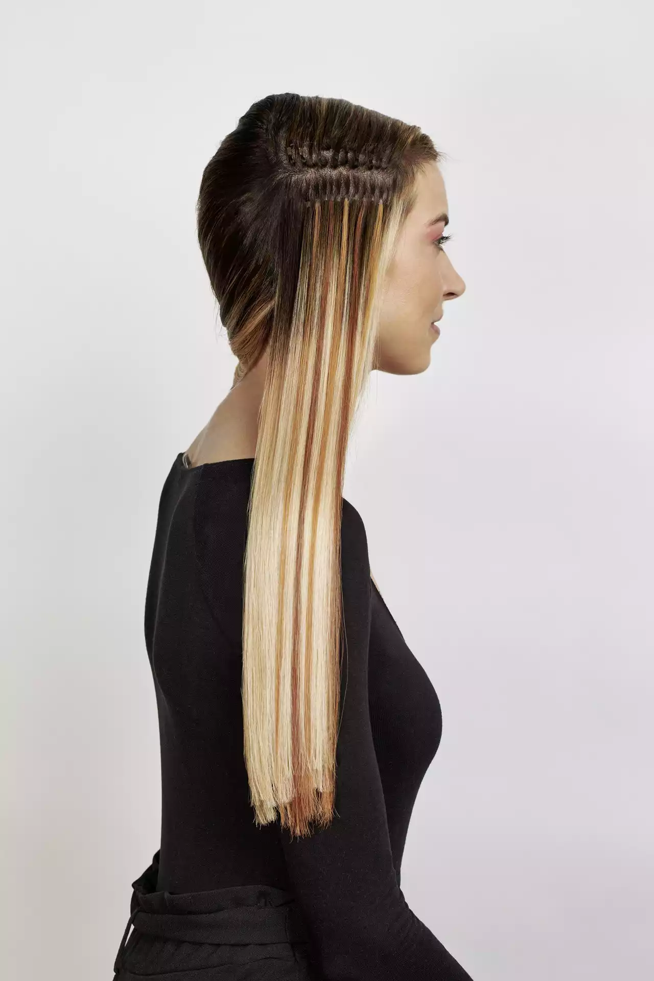 Bewusst wurden GL PRE-BONDED Extensions mit helleren Farbtönen gewählt, weil sich damit das gewünschte Farbergebnis leichter erreichen lässt. Im unteren Bereich sind es Extensions in einer größeren Farbvielfalt, um mehr Struktur zu schaffen. Im oberen Bereich verwendet Mario – entsprechend der Farbe des Eigenhaares – ein warmes, helles Blond, um natürliche und gleichmäßige Übergänge zwischen Eigenhaar und Extensions zu ermöglichen.