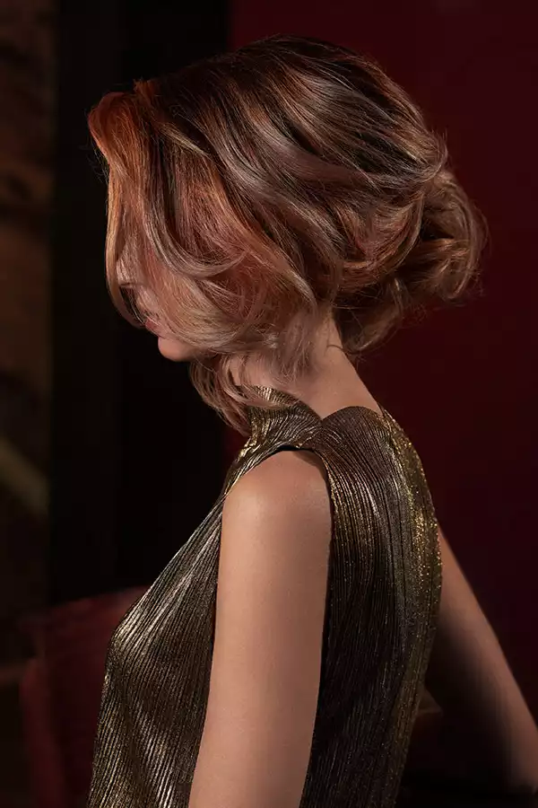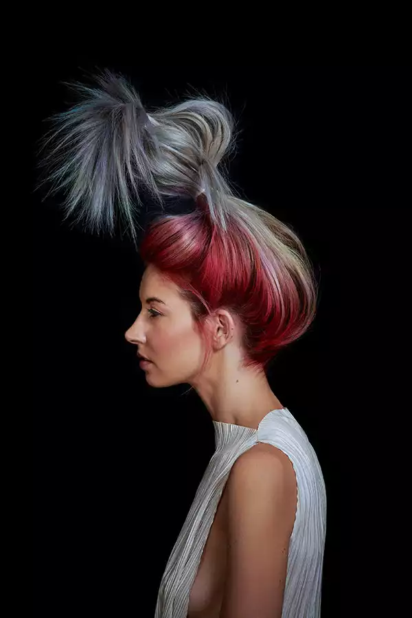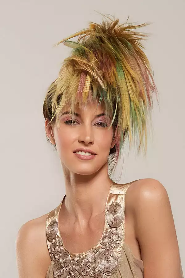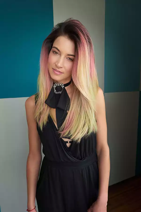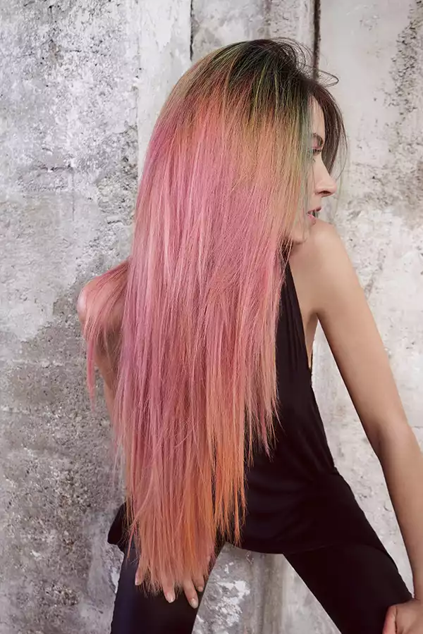 Das französische Wort „balayer“ bedeutet soviel wie „fegen“ oder „frei aufpinseln“. Und das ist bekanntlich die Technik, mit der Balayage-Looks erzeugt werden. Mario dringt dabei in eine völlig neue Farbwelt vor: Gelb, Pink und ein Hauch von Grün prägen das Bild. Eigentlich Farben, die gewöhnlich als bunt erlebt werden. Beim Look 3 wirken sie dennoch elegant, weil der dunklere Bereich am Oberkopf immer den nötigen Halt gibt.