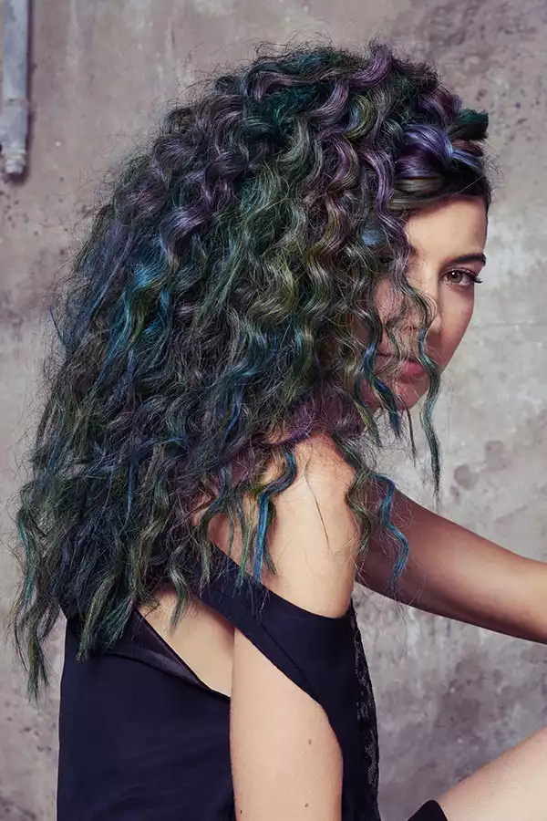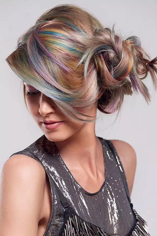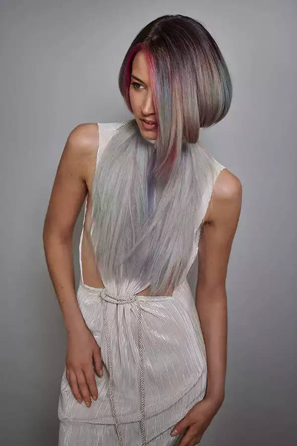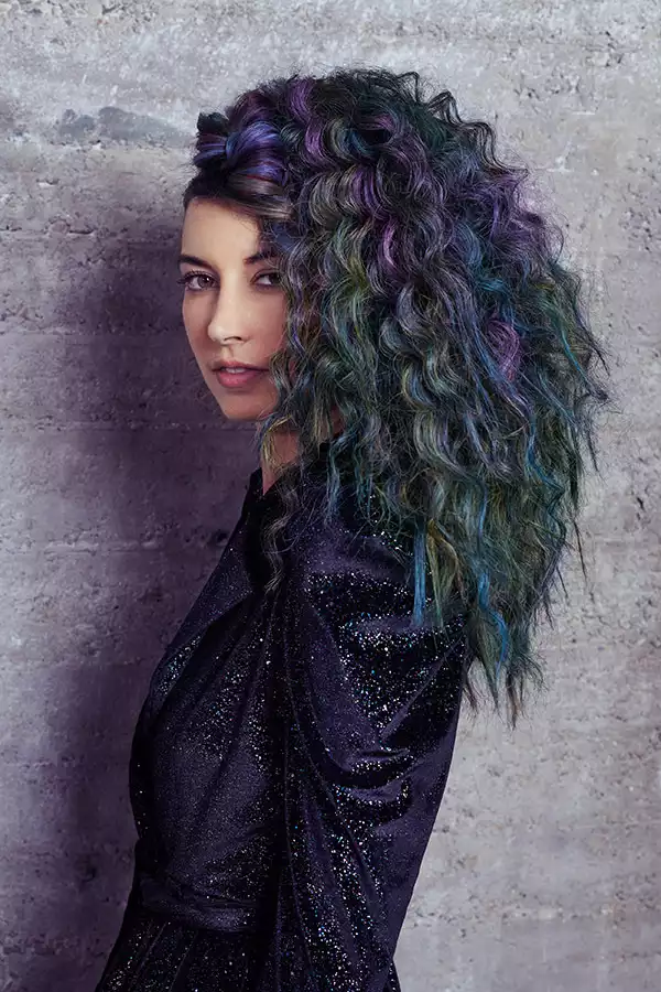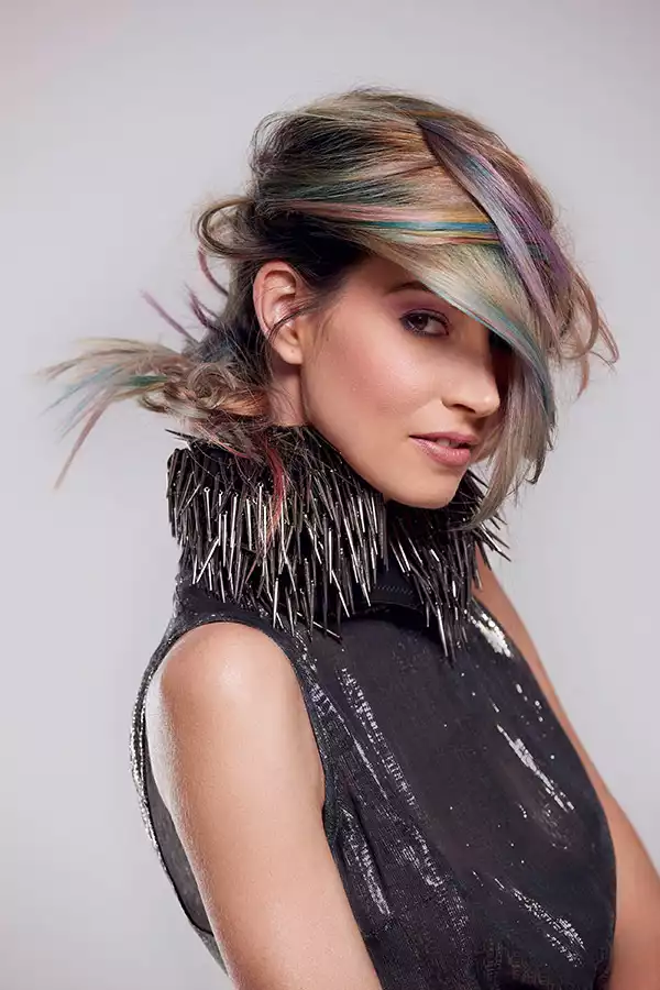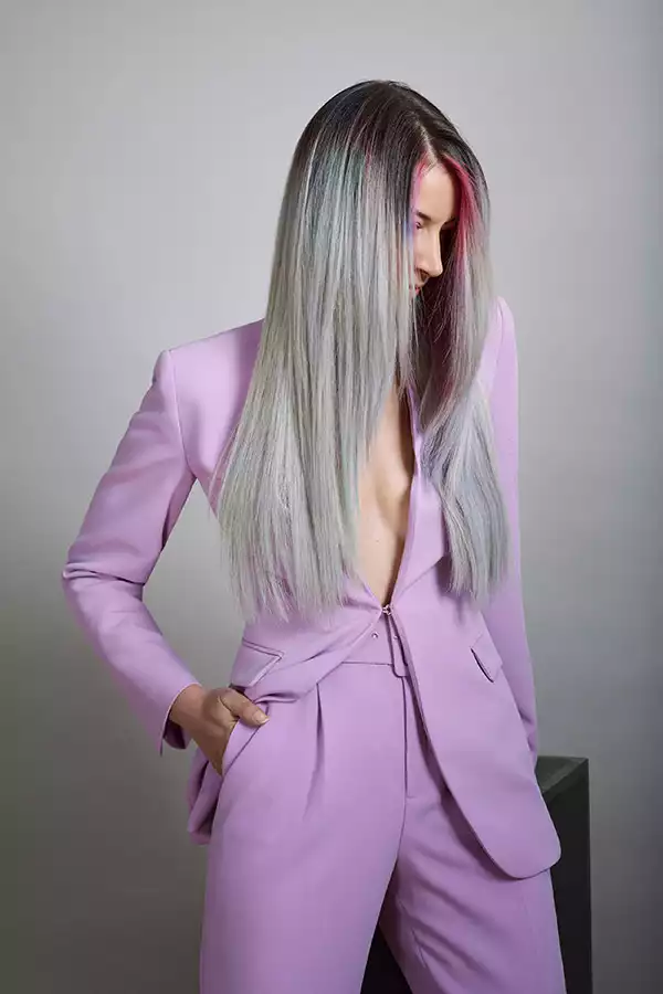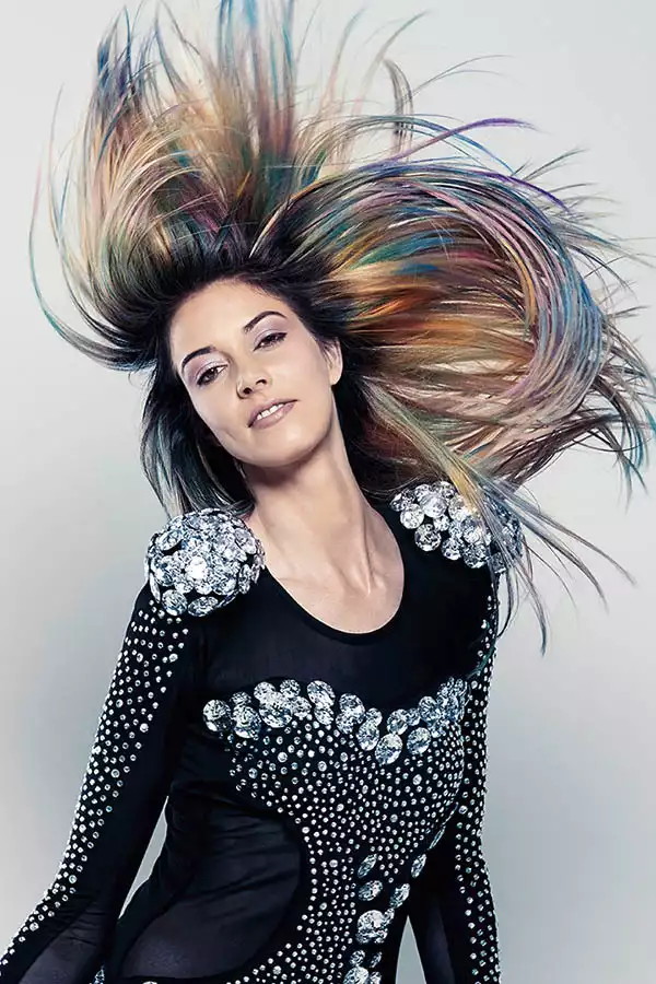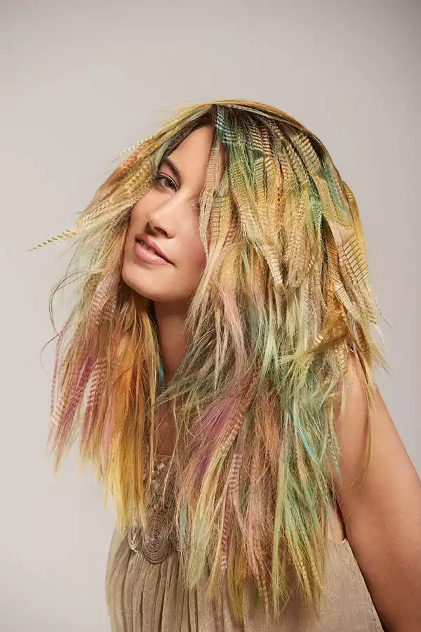 Wenn 12 Nuancen aufeinandertreffen, dann ist mit einem ziemlich starken Farbsound zu rechnen. Wie laut es dann wird, zeigt Look 2. Kontraste sind hier absolut erwünscht. Und es ist auch erwünscht, dass mit jeder Bewegung neue Spektren sichtbar werden. Dass die Haare dank GL PRE-BONDED Extensions die Farbe bis in die Spitzen stark und kontrastreich zeigen, steigert diesen Effekt noch zusätzlich. Hier wurden kühlblonde Strähnen verwendet, um mit dem Eigenhaar identisch zu sein und eine gleichmäßige Ausgangsbasis zu schaffen. Die aufgetragenen Farben reagieren dadurch gleichmäßiger und intensiver auf das Gesamthaar.