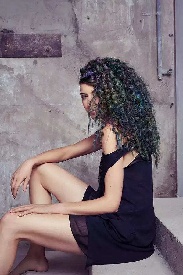 Crazy Colors? Ganz im Gegenteil! Alle Farben in Look 5 kommen 1:1 in der umgebenden Landschaft vor. Und wie die Landschaft verändern sie je nach Licht und Schatten ihren Charakter. Marietta fühlt sich in dieser Harmonie von Natur und Haar sichtlich wohl. Wichtig für den natürlichen Touch des Looks ist der dunkle Haaransatz, der den Farblook und die Bondings erdet. Der grüne Verlauf von Hell auf Dunkel unterstreicht das zusätzlich. Zur Haarstruktur: Der Ansatz wurde mit dem Lockenstab gewellt, in der Länge wurde das Haar abwechselnd geknotet und gekreppt.
